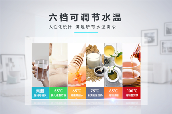 饮水机以加热饮水为根本,不同的生活场景对于水温的需求也各不相同。传统饮水机多为常温水和热水双重选择,使用限制较大。为提升产品的人性化体验,荣事达智能温热饮水机采用六档可调节水温设定,常温、55℃、65℃、75℃、85℃、100℃,不同水温可以充分满足大众直饮、冲奶、泡茶等各类饮水使用需求,生活更为简便。