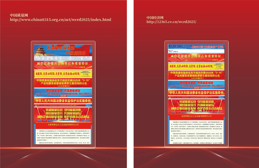 在由中国质量检验协会主办的2025年“3.15”产品和服务质量诚信承诺的主题活动中,荣事达水工业公司凭借卓越的产品品质及良好的社会形象,获得协会以及专家的一致认可,荣膺“全国行业质量领先品牌” “全国产品和服务质量诚信承诺企业” “全国消费者质量信誉保障产品” “全国质量检验稳定合格产品”多项荣誉,并在中国质量网、中国经济网、中国产品质量信誉网等多家媒体上集中展示和公告。