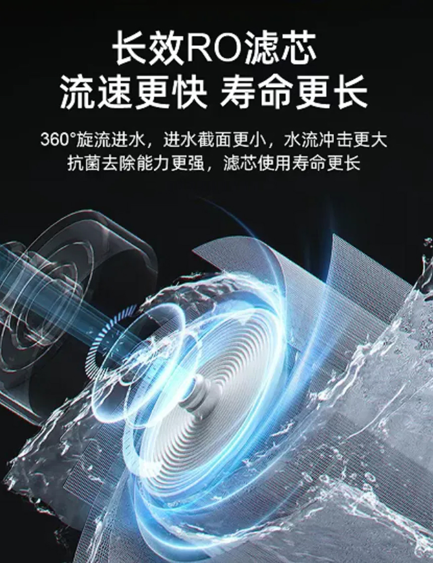 核心采用3芯5级过滤、RO反渗透技术,强力滤除重金属、细菌等有害物质。同时,其 360° 旋流进水设计,可实现更快流速,延长使用寿命,且抗菌去除能力更强。贴心升级大孔径出水龙头,接满一杯仅需数秒,告别涓涓细流的漫长等待。