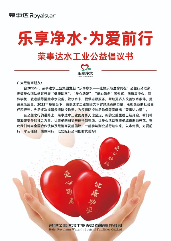 03 荣事达水工业经销商积极响应集团公益倡议,热衷于健康助学、爱心敬老、爱心助残、疫情防控等多种形式的公益行动,截止到目前,经销商们的公益活动已遍及安徽、南京、湖南、江苏、陕西、江西、河南、河北等多个地区,以健康好水,温暖每一个城市。