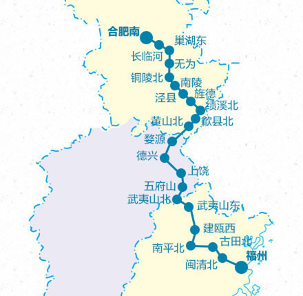合福高铁是京福高铁的重要组成部分,全长806公里,是国内第四条设计时速350公里的双线电气化高速铁路。作为沟通华中与华南地区的一条大能力客运,途经安徽、江西和福建三省,由于其线路贯穿武夷山、三清山、婺源、黄山多个著名旅游景区而被称为国内颜值最高的最美高铁。
