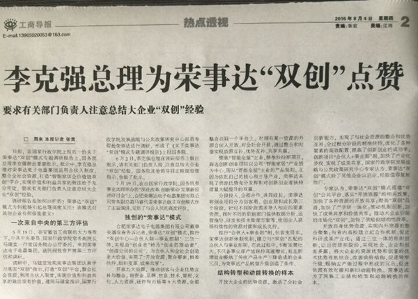 日前,在国家行政学院上报的一份关于荣事达“双创”模式专题调研报告上,国务院总理李克强做出重要批示。批示中,李克强总理对荣事达电子电器集团运用合伙人制度,整合全社会资源,打造“智能家居全价值链双创”平台,实现价值和利益共享的做法给予充分肯定,要求有关部门负责人注意总结大企业“双创”经验。