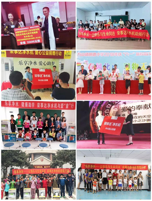 早在2011年,荣事达就面向全国开展“乐享净水?健康助学行动”,截至目前已向安徽、江苏、陕西、江西、河南、河北等多个地区的学校捐赠净水设备数千套。2016年,荣事达走进红色革命老区金寨县,向全国首个希望小学——金寨希望小学捐赠了直饮水设备,两千多名师生因此喝上了健康直饮水。之后,荣事达联合金寨希望公益服务中心及地方公益协会共同发起“给山区孩子一杯水”——援建金寨中小学净水设备公益活动,荣事达援建400多套直饮水设备,帮助全县的学校解决了饮水难题。该公益项目引发了社会各界热烈关注,被评为“安徽省十佳学雷锋志愿服务项目优秀典型”。立责于心,健康助学,在公益这条路上,荣事达未来将继续推进,为更多校园送去安全水,尽心呵护孩子们健康成长。