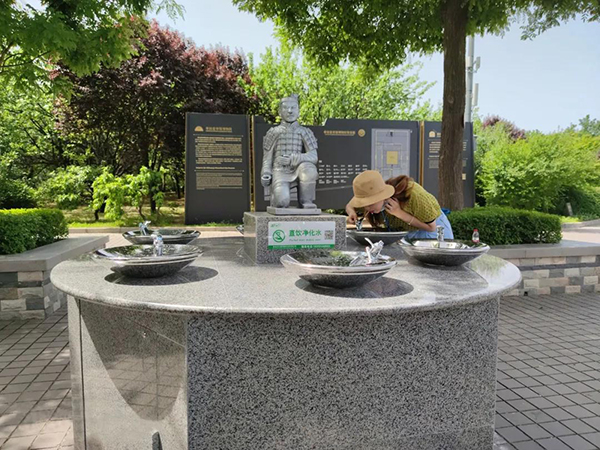 为更好地与环境相融合,此次秦始皇帝陵博物院所采用的直饮水设备皆为定制打造。多级水质处理系统融合RO反渗透分离、臭氧消毒、紫外线杀菌等先进净水工艺,能够充分去除水中各类有害物质,出水纯净健康。而独具匠心的外形则采用兵马俑造型雕刻搭配天然大理石台体,青灰庄严的古典色调与恢弘壮阔的秦陵风采相得益彰,已然成为景区中一道亮丽的“绿色服务”风景线,已申报外观设计专利,备受行业瞩目。
