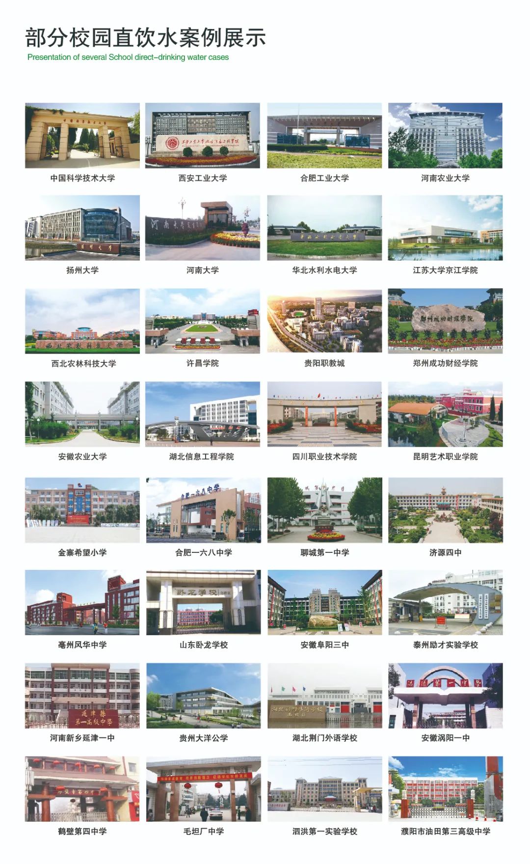 荣事达水工业先后承建了中国科学技术大学、河南大学、西北农林科技大学、江苏省丹阳市第五中学等3000多所学校的直饮水工程,‘喝’护千万师生饮水健康。