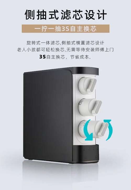 科技让生活更美好。荣事达智能反渗透纯水机利用科技之力实现产品创新,让更多人都能享受科技带来的美好生活,侧抽式滤芯设计,一拧一抽3秒自主换芯,真正体现了将细节做到极致。