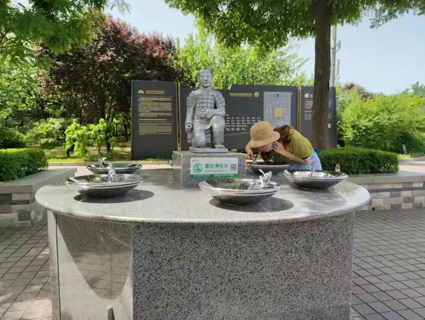 饮水点外形则采用兵马俑造型雕刻搭配天然大理石台体独特设计,按压式喷水龙头方式取水
