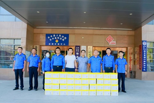 8月12日上午,荣事达水工业集团为双凤城市管理行政执法中队送去一批苏打水,向坚守在城市管理一线的工作者们表达敬意。