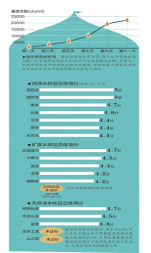 本次比较试验还模拟日常饮用水习惯,在设计的检测周期内,每天取一定水样,定时监测菌落总数。实验中,大多数水样随着开瓶时间越来越长,菌落总数呈增长趋势,开瓶第5-7天后,出现急剧增长态势。